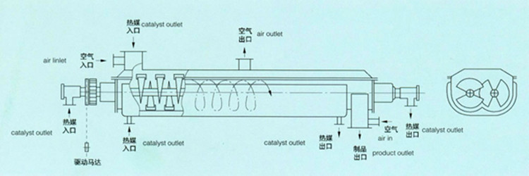 空(kong)(kong)心(xin)軸上(shang)密集排(pai)列著楔(xie)型(xing)中空(kong)(kong)槳(jiang)葉,熱(re)(re)介(jie)質經空(kong)(kong)心(xin)軸流(liu)經槳(jiang)葉。單位有(you)效容(rong)積內傳(chuan)(chuan)熱(re)(re)面積很大(da),熱(re)(re)介(jie)質溫(wen)度從-40℃到(dao)320℃,可以(yi)是水蒸汽,也(ye)可以(yi)是液(ye)體型(xing):如熱(re)(re)水、導(dao)熱(re)(re)油等。間接(jie)傳(chuan)(chuan)導(dao)加熱(re)(re),沒有(you)攜帶空(kong)(kong)氣帶走熱(re)(re)量(liang),熱(re)(re)量(liang)均用(yong)(yong)來加熱(re)(re)物(wu)(wu)(wu)料。熱(re)(re)量(liang)損失僅為通過器體保(bao)溫(wen)層向環(huan)境的(de)散熱(re)(re)。楔(xie)型(xing)槳(jiang)葉傳(chuan)(chuan)熱(re)(re)面具有(you)自(zi)清潔(jie)功能。物(wu)(wu)(wu)料顆(ke)粒與楔(xie)型(xing)面的(de)相對(dui)運動(dong)產生洗刷作用(yong)(yong),能夠洗刷掉楔(xie)型(xing)面上(shang)附著物(wu)(wu)(wu)料,使運轉中一(yi)直保(bao)持著清潔(jie)的(de)傳(chuan)(chuan)熱(re)(re)面。槳(jiang)葉干(gan)燥機的(de)殼體為w型(xing),殼體內一(yi)般安排(pai)二到(dao)四根空(kong)(kong)心(xin)攪軸。殼體有(you)密封端蓋與上(shang)蓋,防(fang)止物(wu)(wu)(wu)料粉塵外泄及收集物(wu)(wu)(wu)料溶(rong)劑蒸汽。出料口處設置一(yi)擋(dang)扳(ban),保(bao)證(zheng)料位高(gao)度,使傳(chuan)(chuan)熱(re)(re)面被物(wu)(wu)(wu)料覆(fu)蓋而充分發揮作用(yong)(yong)。熱(re)(re)介(jie)質通過旋(xuan)轉接(jie)頭,流(liu)經殼體夾套及空(kong)(kong)心(xin)攪拌(ban)軸,空(kong)(kong)心(xin)攪拌(ban)軸依(yi)據熱(re)(re)介(jie)質的(de)類(lei)型(xing)而具有(you)不同的(de)內部結構(gou),以(yi)保(bao)證(zheng)******的(de)傳(chuan)(chuan)熱(re)(re)果(guo)。