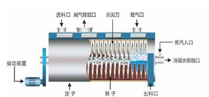 物料由進料口送入干燥機(ji),工(gong)作介質在(zai)外殼和空(kong)心(xin)軸(zhou)之間流(liu)動(dong),通過夾套、空(kong)心(xin)軸(zhou)和軸(zhou)上焊接的空(kong)心(xin)盤(pan)片傳輸(shu)熱量,物料被(bei)間接加熱干(gan)化,產生的水蒸汽聚集在(zai)干(gan)燥機的穹頂,由(you)栽氣帶(dai)出干(gan)燥機。空(kong)心(xin)盤(pan)片與(yu)軸(zhou)完全垂(chui)直,對物料沒有切劇,通過盤(pan)片邊緣(yuan)的推進/描拌器(qi)的(de)作(zuo)用,對物料進行推進攪(jiao)拌,不(bu)斷更新(xin)干燥(zao)(zao)面,從而實現干燥(zao)(zao)的(de)目的(de)。